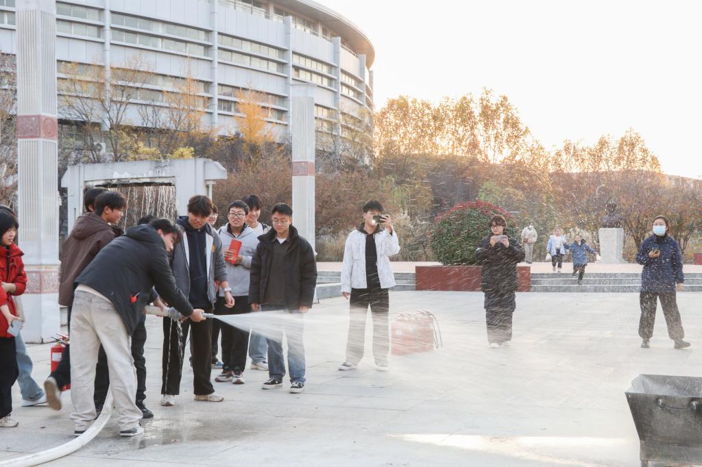 进入灭火实操环节后,工作人员先详细讲解了灭火器的工作原理与适用场景,随即现场示范完整操作流程。同学们依次上前体验,在一对一指导下,精准完成了灭火器的开启与灭火动作,扎实掌握了基本灭火技能。紧接着,工作人员又对消防水栓的结构、操作步骤及注意事项进行专业讲解,同学们分组开展实操练习,在工作人员的耐心纠错与示范中,逐步熟练掌握消防水栓的使用方法,有效提升了应对突发火灾的实战能力。