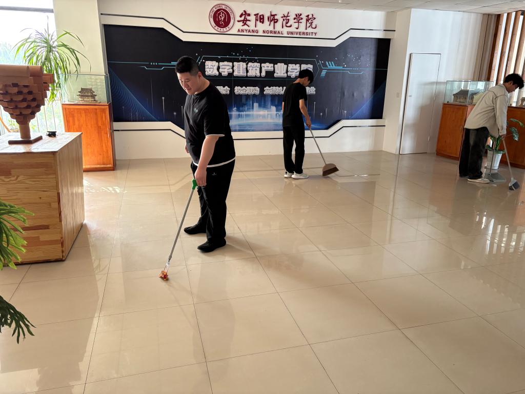 活动前,全体人员按区域划分为 5 个小组,分别负责一楼大厅、三楼展厅、四楼阶梯、409 教室、506 教室的清扫任务。同学们手持清洁工具,对教室桌面、桌斗、黑板、地面及公共区域进行全面清理,重点整治卫生死角。劳动中,大家分工明确、配合默契,以饱满热情投入工作,经过一个多小时的奋战,学院教学环境焕然一新。