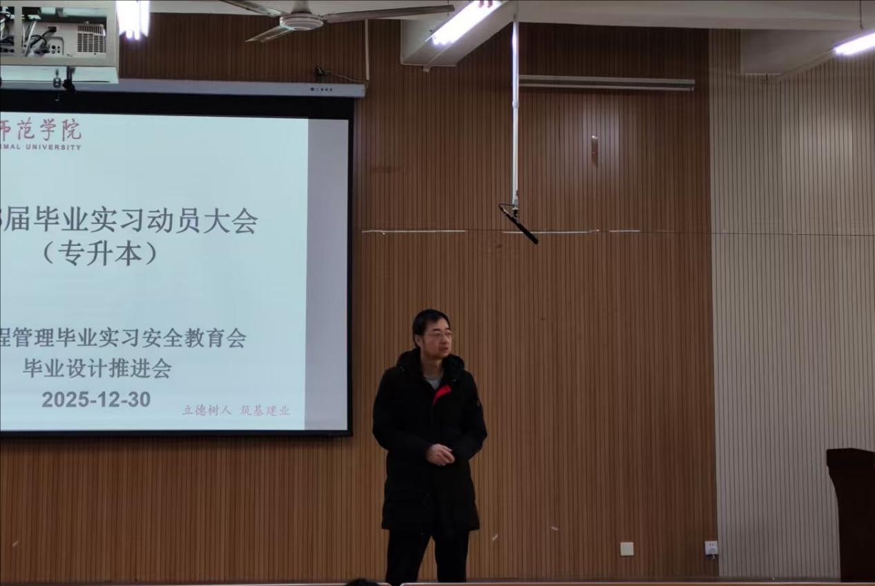 12月30日,我院工程管理系在阶梯教室召开2026届工程管理专升本毕业实习动员会暨实习安全教育会、毕业设计推进会。工程管理系主任侯纲教授主持会议,指导教师与2026届工程管理专升本全体学生参会。