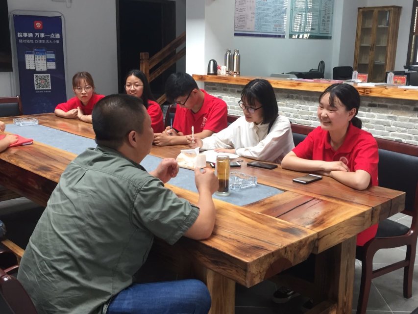 小队成员向委员会介绍了走访目的与身份后,受到了委员会成员的热情接待。村民委员会委员为我们详细讲解了宏村的历史发展与现代规划。随后,小队成员就宏村古建的保护措施、旅游产业的发展等问题提出疑问,村民委员会委员表示通过多方面的协调与规划,深挖内涵、培育特色、完善设施,提升文化品位,促进文化旅游融合发展。通过发展全域旅游对发展当地经济、保护文化遗产和满足当地村民日益美好生活起到了重要作用。访谈过后,村民委员会主任与委员亲切地与小队成员合影留念。
