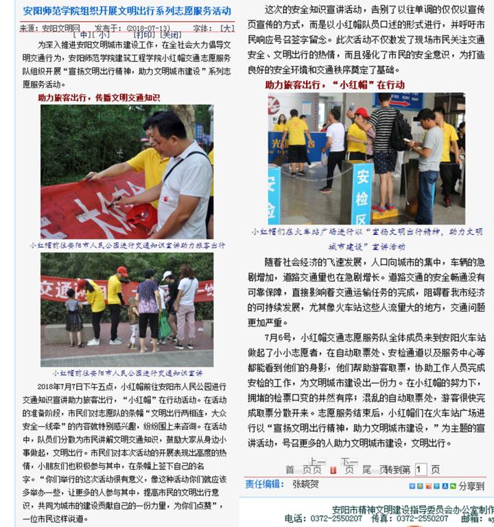 编者按:安阳师范学院建筑工程学院小红帽交通志愿服务队组织开展文明出行系列志愿服务活动。《安阳文明网》对相关情况进行了报道。