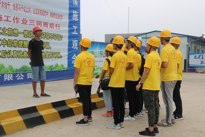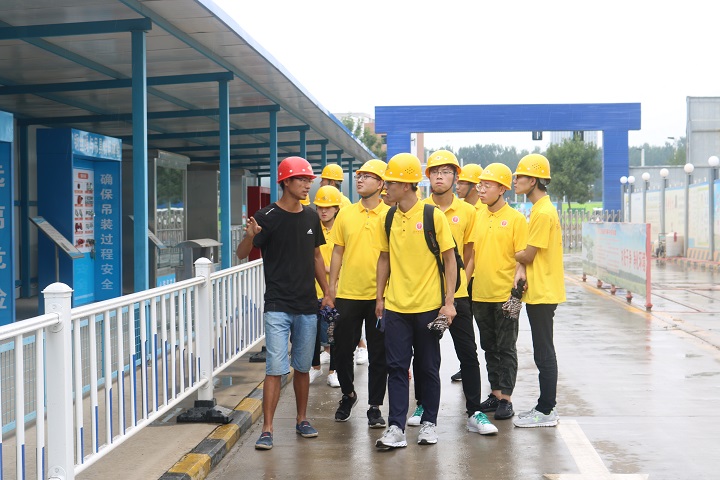 为日后实践队员进入工地的安全提前做好保障,工地负责人对实践队员们进行了简单的培训。负责人倾囊相授,把如何正确取戴安全帽的方法教给队员,并且让队员体验了安全帽承受性能测试,接着就综合用电问题,钢丝绳与吊具的辨识等问题进行了详细解说。