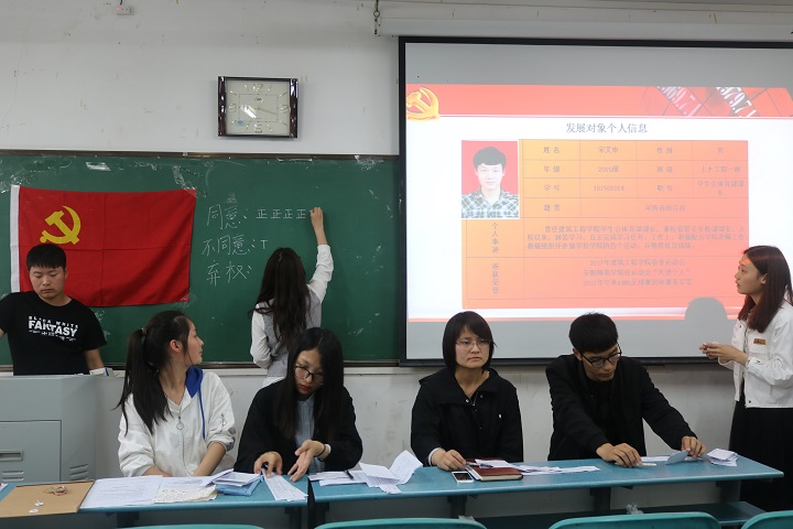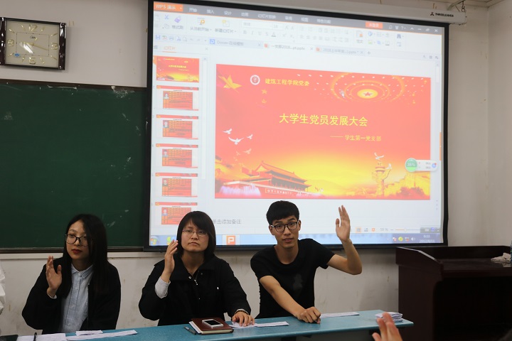 本次党员发展大会采用“答辩责任制”,严格按照规定程序进行。大会伊始,全体起立奏响庄严的《国际歌》。接着,由主持人介绍本次应出席的党员答辩委员会成员名单。随后进入答辩阶段,发展对象结合PPT展示自己在考察期的综合表现,并抽取题目进行答辩,如实地反映自己对党章、党史等基本理论知识以及国内外热点时事的掌握情况。党支部大会本着公平、公正、公开的态度进行了认真讨论,并以无记名投票方式进行表决。大会最后由各支部书记老师发言并对大会做出总结。至此,大学生党员发展大会圆满结束。